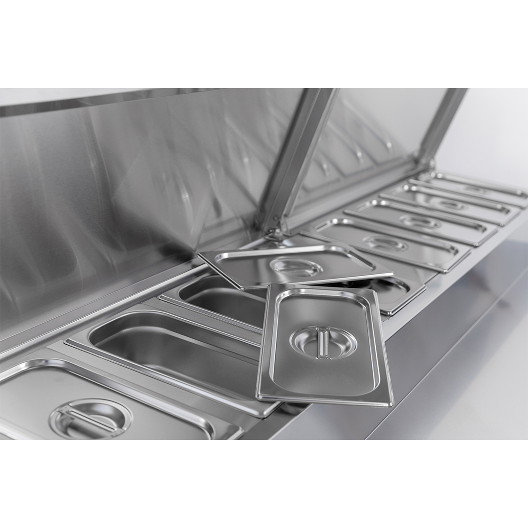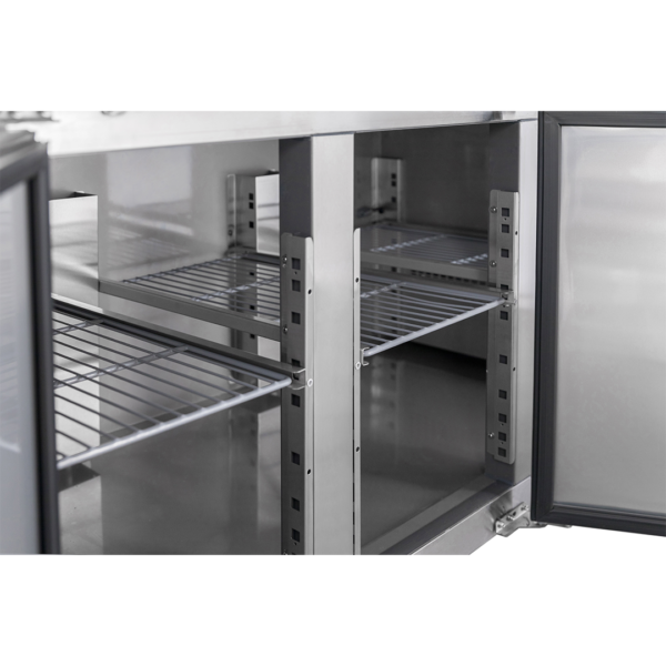 The Diaminox two door saladette prep counter brings together a raised chilled gastro topping section with a triple hinged door refrigerated cabinet resulting in an organised food preparation area with everything you need during a busy service close to hand.