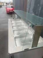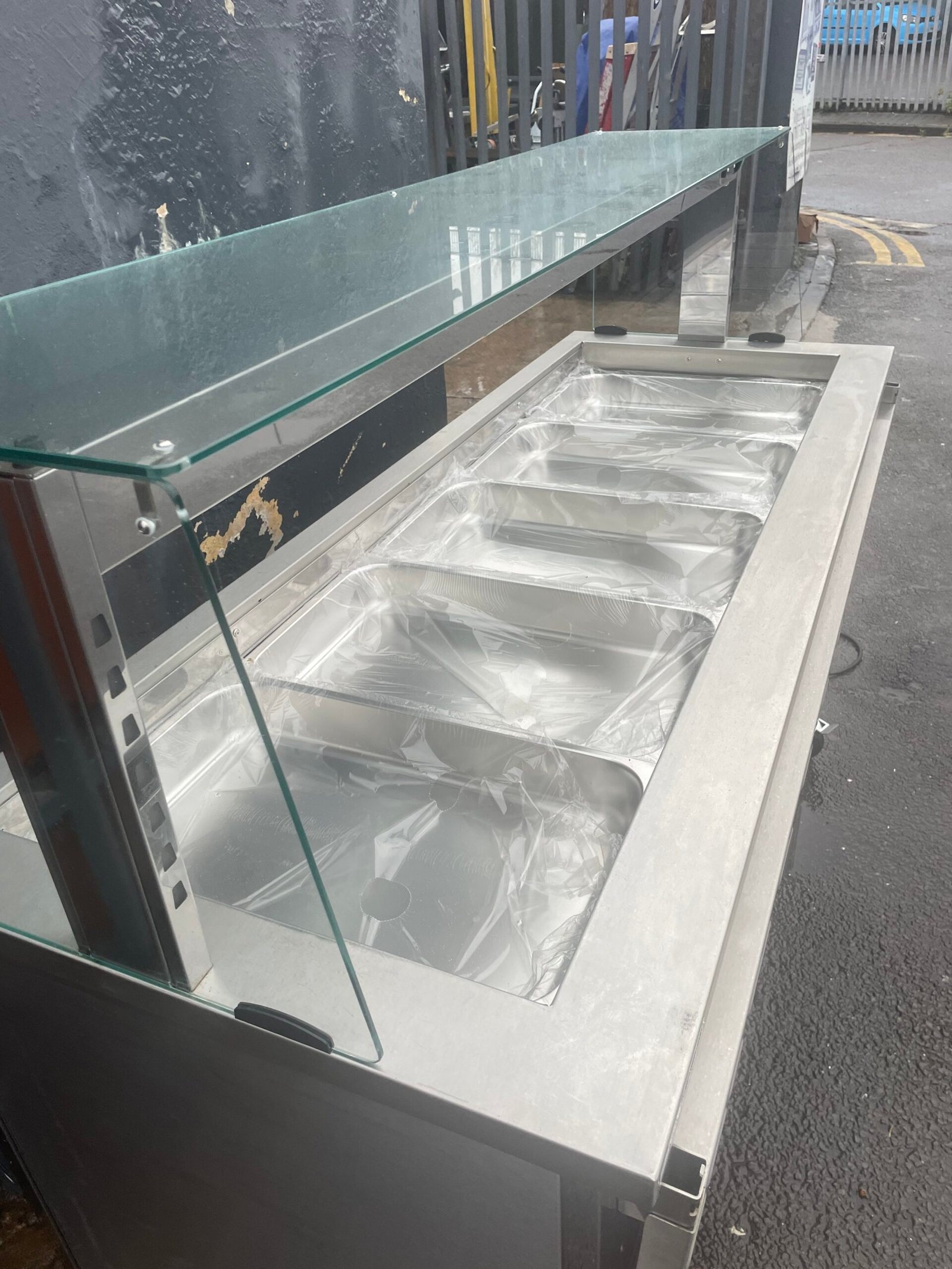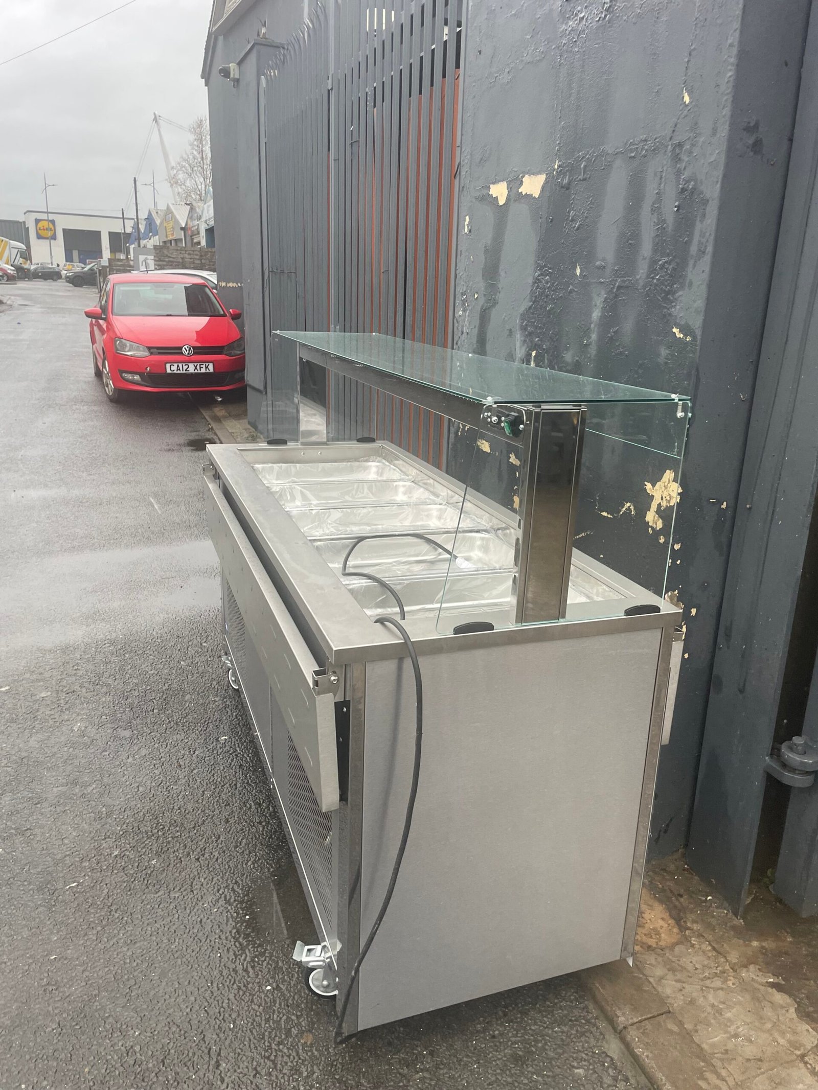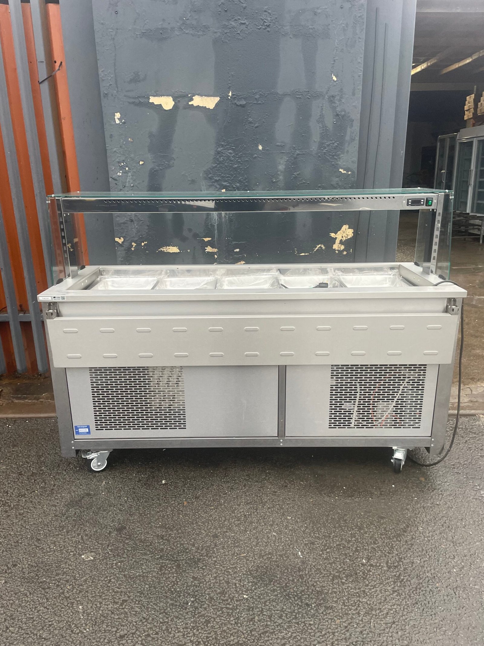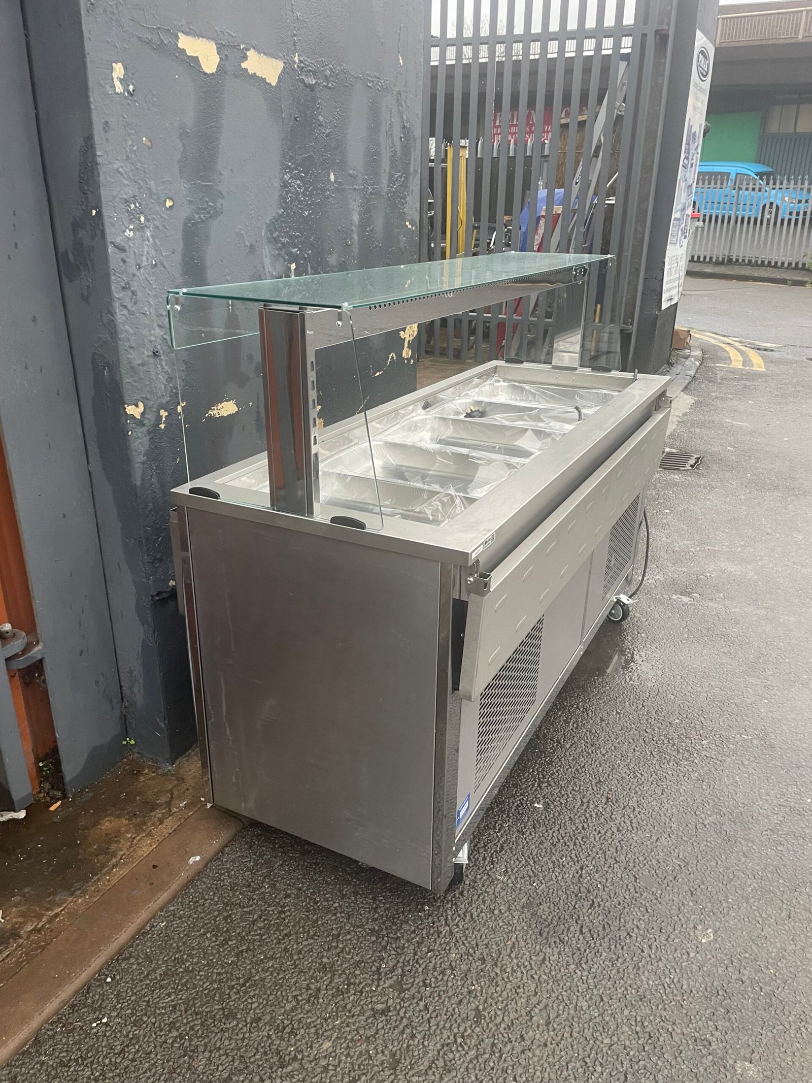 Whether as part of a fully modular servery unit or used singly, the Moffat Refrigerated Counter is the ideal choice for serving salads and other chilled foods in assisted service or self-service catering. Five full size (1/1) gastronorm refrigerated wells provide space for a large selection of chilled foods, whilst the ambient storage underneath helps you to keep plates or utensils within easy reach. Stylish and attractive, the salad bar is ideal for use in canteens and cafeterias. Includes a built-in drop-down tray rail.